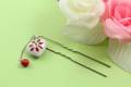 絵柄には赤絵で可愛い花のイメージを描きアクセントの赤の玉も有田焼で出来ていて大変手間暇かかるハンドメイドのかんざしです。