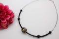 有田焼の黒釉を施した磁器玉に金彩で桜の花を描き天然石オニキス(8mm玉)をアクセントにカットガラスを使用しオシャレなペンダントに仕上げました。