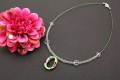 製作が大変難しい形ですがどの角度からでも同じに見えるように全体に絵付けしており天然石ローズクォーツ(8mm玉)をアクセントにカットガラスを使用しオシャレなペンダントに仕上げました。