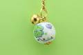 有田焼の絵柄の特徴であるアヤメやぶどうなどを直径約15mmの玉に色鮮やかに描きました。また二宮閑山独自で開発した釉薬でるり色やグリーンなど透明感抜群で綺麗なキーホルダーに仕上げました。
