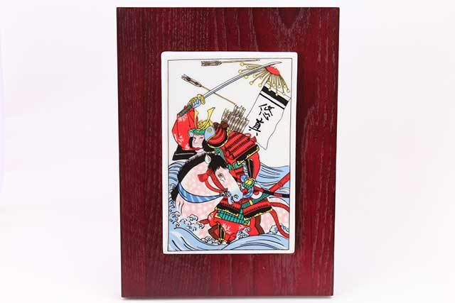 勇敢な武者を有田焼の陶板に描きのぼり旗にお子様の名前を入れられます。
